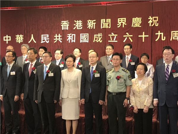 【香港商報网訊】記者莊海源報道:香港新聞界舉行慶祝中華人民共和國成立69周年酒會,行政長官林鄭月娥、中聯辦副主任楊健、外交部駐港特派員公署副特派員宋如安、解放軍駐港部隊副政委陳亞丁等出席主禮。