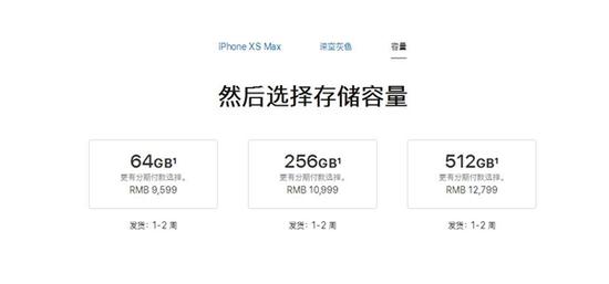 iPhone XS Max 64GB、256GB和512GB对应售价分别是9599元、10999元和12799元;