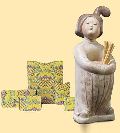 “海水江崖”真丝织锦缎系列及“俑仕相伴”系列彩绘陶人俑创意牙签筒。