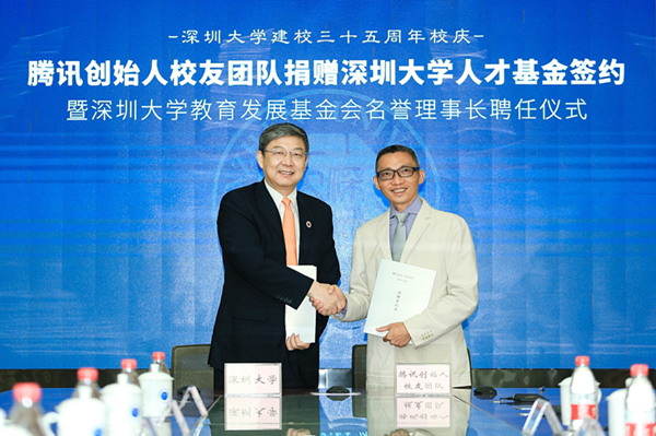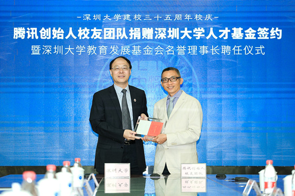 【香港商报网讯】记者林丽青报道:9月21日,值深圳大学35周年校庆之际,腾讯四位创始人马化腾、张志东、陈一丹、许晨晔,以腾讯创始人校友团队的名义,联合向母校深圳大学捐赠3.5亿元人民币,共同发起设立深圳大学人才基金,所捐款项将作为深圳大学人才基金的首笔启动资金。其中马化腾捐2亿元人民币,张志东、陈一丹、许晨晔每人各捐5千万元人民币。在捐赠签约仪式现场,深圳大学校长李清泉向腾讯创始人校友团队代表陈一丹颁发聘书,聘任陈一丹担任深圳大学教育发展基金会首任名誉理事长。