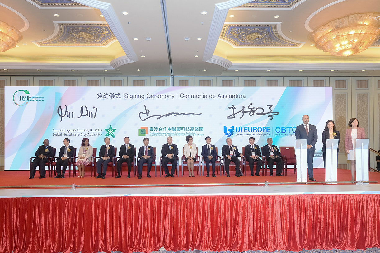 开幕式上,澳门特别行政区政府行政长官崔世安、中央人民政府驻澳门特别行政区联络办公室主任郑晓松等主礼嘉宾与国际青年中医生代表共同启动国际青年中医生交流基地。同时,在澳门特别行政区政府行政长官崔世安等主礼嘉宾的见证下,产业园与迪拜健康城管委会、中国比利时科技园、康美药业股份有限公司、中葡投资管理有限公司等国际合作机构及重点企业签订了合作协议,此次与多家国际机构和企业合作,标志着产业园通过搭建优势平台促进澳门建设中医药科技产业发展平台工作初见成效,具有国际竞争力的专业化中医药产业园区发展成果显著。
