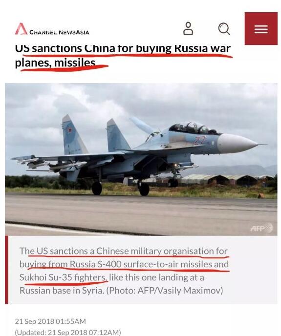 当地时间9月20日美国国务院宣布,因中国人民解放军从俄罗斯采购了苏-35战斗机和S-400防空导弹等武器装备,美国政府决定对中国中央军委装备发展部及其负责人进行制裁。