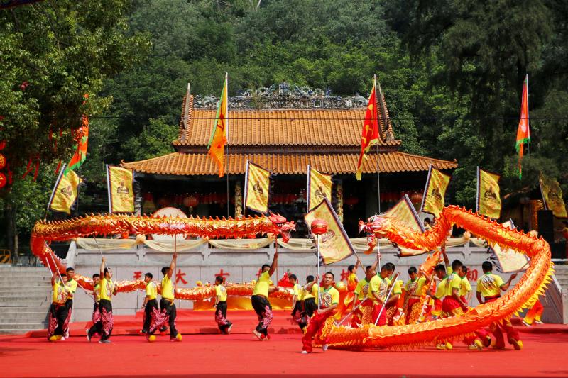九下深遂而响亮的钟声从庙里传来,吉时良辰,钟鼓齐鸣,八个身穿汉服服装的壮年擂响舞台上的八面大鼓,震撼的鼓声响遍山谷,一段激昂的鼓舞点燃群众的热情,台上八面印有盘古王图腾的大鼓缓缓打开,一位身穿汉服的长者祭司出现在台中,念到:“盘古王诞祭祀典礼现在开始”呼唤前来祭拜的子民,由此拉开了本届中国狮岭盘古王民俗文化节的序幕。