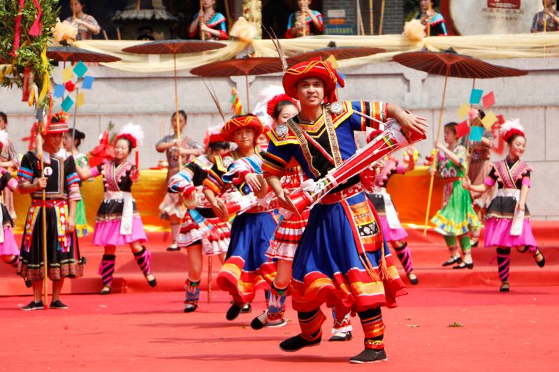 “在古代,每到盘古王诞,瑶胞都会在盘古王庙前庆祝,跳长鼓舞,祭祀盘古王以祈福永昌,但在文革时期一度中断。”本次祈福活动,瑶族的同胞也将来到祭拜的现场,继续这一传统。他们将用自己的方式庆祝这欢乐的节日,他们唱起瑶歌,吹起牛角,打起瑶鼓,跳起长鼓舞与长柄伞舞,与观众区域的三十名盘古舞者相互呼应。台上台下连成一片,形成汉瑶同庆,你中有我,我中有你的场面,表现出民俗文化的交融性。