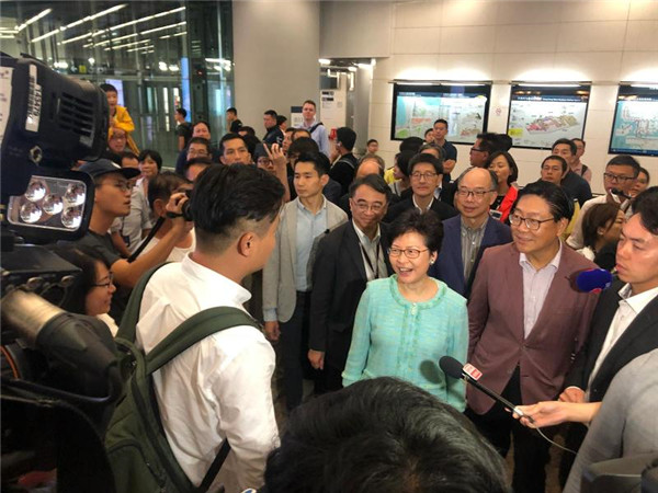 昨晚7時許,行政長官林鄭月娥在陳帆、馬時亨陪同下視察西九龍站半小時。林鄭對第一日開通整體情況感滿意,指雖然出現一些磨合問題,但以大型基建來講屬於正常,港鐵會盡力解決,希望市民以正面和開心態度迎接高鐵開通。她說,在站內接觸到的市民和旅客都好開心,而香港對上一次有大型基建開通,要數到深圳灣口岸和機場口岸。林鄭來到售票處與市民握手、合照,又到抵港大堂參觀,還參觀了站內一間食肆及向負責人了解營運情況。
