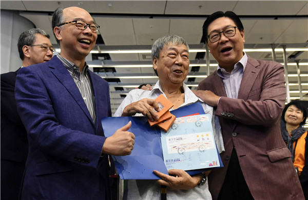 昨天開通儀式後,陳帆局長與馬時亨主席一行向入站市民派發紀念品。期間,他們特別向此前排頭位買車票的梁伯表示祝賀,並與他合影留念。梁伯也早有準備,帶來高鐵紀念郵票小全張,成功地集齊陳局長、馬主席及港鐵一眾高層的簽名,這張紀念郵票小全張可謂「獨一無二」。