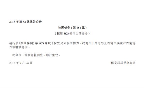 保安局經過3次延長申述期後,該黨召集人陳浩天9月14日提交書面申述並獲保安局接納,經10日後政府刊憲宣布禁止「香港民族黨」運作。