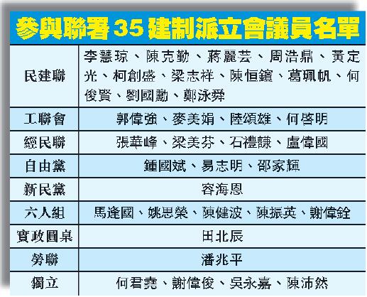 對於保安局局長昨日刊憲,行使《社團條例》授予的權力,在基於維護國家安全、公共安全、公共秩序及保護他人的權利和自由的需要,決定禁止「香港民族黨」在香港運作或繼續運作,35名建制派立法會議員表示全力支持(聯署議員見表)。