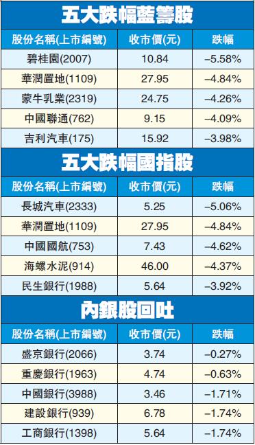 重磅股普遍下跌,騰訊(700)曾低見326元,收市跌近2%至327.8元;汇豐控股(005)及友邦保險(1299)齊跌逾1%;港交所(388)挫2%企224元。市場傳出內房擬搞「黑名單」及擬取消預售,內房股受壓。碧桂園(2007)收跌5.5%,表現最差;華潤置地(1109)及中國海外(688)挫逾3%至4%。另外,市場預期聯儲局本周加息,香港地產股有沽壓。長實集團(1113)、信和置業(083)及恒隆地產(101)全線跌逾1%。內銀板塊亦現回吐,中國銀行(3988)、建設銀行(939)及工商銀行(1398)均跌1.7%。