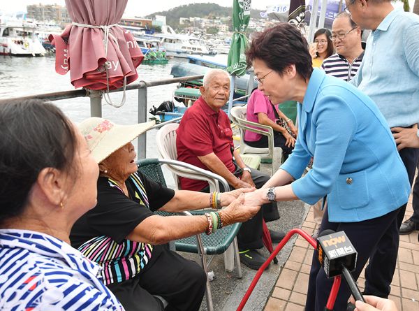林鄭月娥昨午到訪西貢市中心,了解市民受颱風影響的情況。