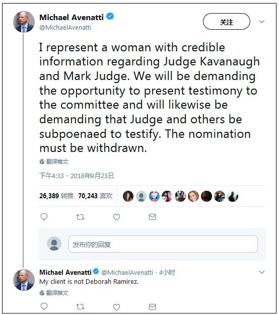 阿文蒂写道:“我代表一位对卡瓦诺法官和马克贾奇有可靠证据的女士。我们会要求有向委员会提出证词的机会,并同样要求法官和其他人被传唤作证。提名必须撤回。”阿文蒂特别指出,这位女性不是拉米雷斯。