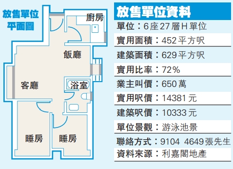 放售的單位位於6座27樓H室,業主叫價650萬元,以實用面積452平方呎計算,實用呎價約14381元。單位內部間隔,兩房一廳,建築面積629呎,實用比率72%。
