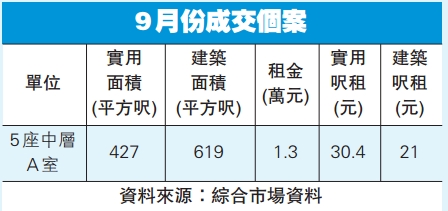 成交方面,本月暫錄1宗租務成交,租出單位實用面積427平方呎,成交租金1.3萬元,實用呎租30元。