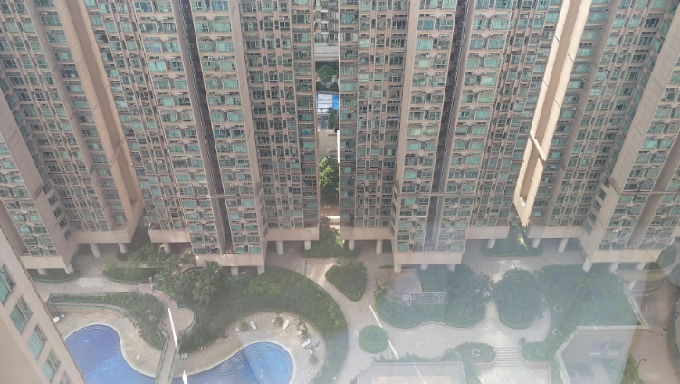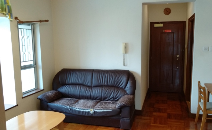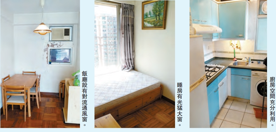 單位的兩間睡房朝向為東南方,間隔為眼鏡房設計。全屋整體上裝修以實用性為主要考慮,因此採用了精簡裝修的風格。入門後的客飯廳範圍一側有大窗戶,為單位採光的主要來源,從這個方向可以望到屋苑的游泳池景致和部分樓景。廳的另一側設有對流窗。廁所位於單位中部位置,住客位於哪個廳、房間使用廁所都非常方便。廚房位於飯廳左側近大門口,整體上算正常保養,洗衣機安放在料理台下方,用盡了空間。