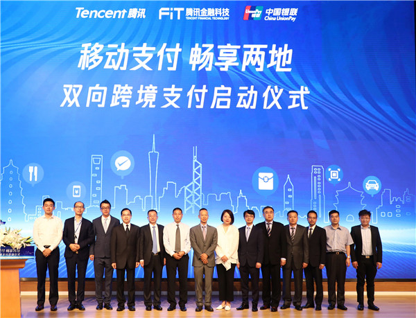 雙向跨境支付啟動儀式,昨日在騰訊深圳總部新樓舉行。中國人民銀行支付結算司司長溫信祥、騰訊副總裁江陽、香港金融管理局助理總裁劉中健,以及中國銀聯執行副總裁郝哲等嘉賓,在現場共同按下開啟手印。
