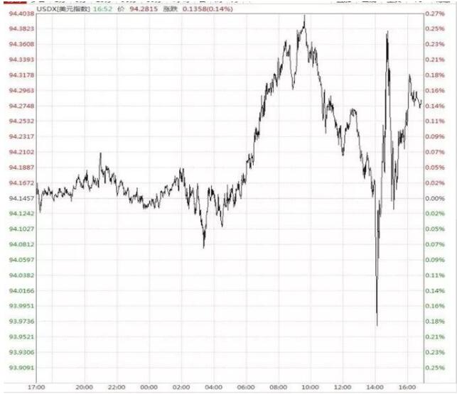 美联储声明发布后,金融市场宽幅震荡,美元指数跳水20点后直线反弹,鲍威尔讲话后,美元指数继续拉升20点,转涨0.25%报94.4,但由于鲍威尔讲话偏鸽派,美元指数再度跳水至平盘附近,振幅达40点,最终收涨0.18%报94.3。
