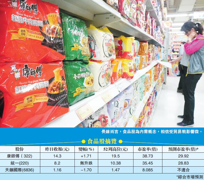 新一輪中美貿易戰開打,對股市造成負面影響,多個板塊止漲下挫,市場觀望氣氛濃。早前颱風過後見反彈的食品股近日也回調。不過,長線而言,食品股為內需概念,相信受貿易戰影響微,想趁低吸納,可留意康師傅(322)、統一企業中國(220)及天韻國際(6836)。 香港商報記者 范曉昱