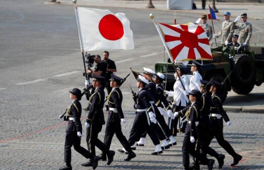 今年7月14日法国国庆日阅兵式上,日本陆上自卫队受邀参加,受阅的7人小分队当天除了高举国旗之外,还手持另一面旗帜“旭日旗”。这一举动持续引发韩国媒体的强烈批评。