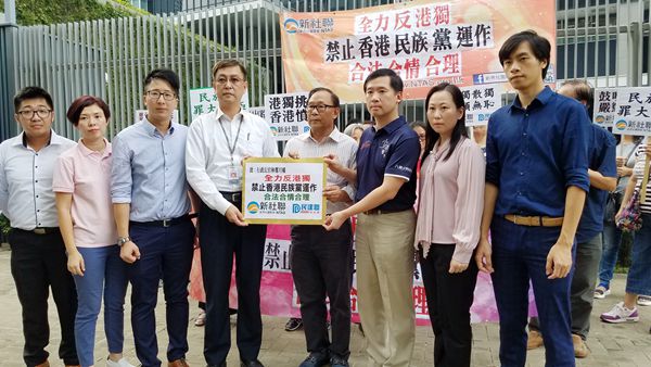 新社聯約30人昨日遊行到政府總部,他們高叫口號「民族黨危害國家安全」、「反對民族黨運作」、「民族黨罪大惡極」等。他們表示,近年一些組織或個人一直鼓吹分裂國家,與外國勢力互相勾結,更公然宣稱為「港獨」不惜流血,認為凡有組織、有預謀地從事分裂國家行為,已嚴重危害了國家安全,特區政府禁止其運作是罪有應得。