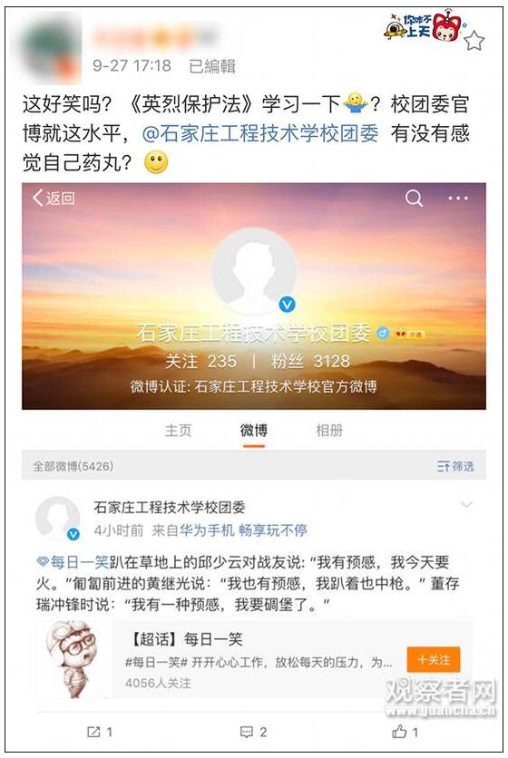 27日下午,某微博军事博主愤怒地问道,“这好笑吗?《英烈保护法》学习一下?”受到质疑的正是一张显示为@石家庄工程技术学校团委 微博内容的截图,该账号被认证为“石家庄工程技术学校官方微博”。
