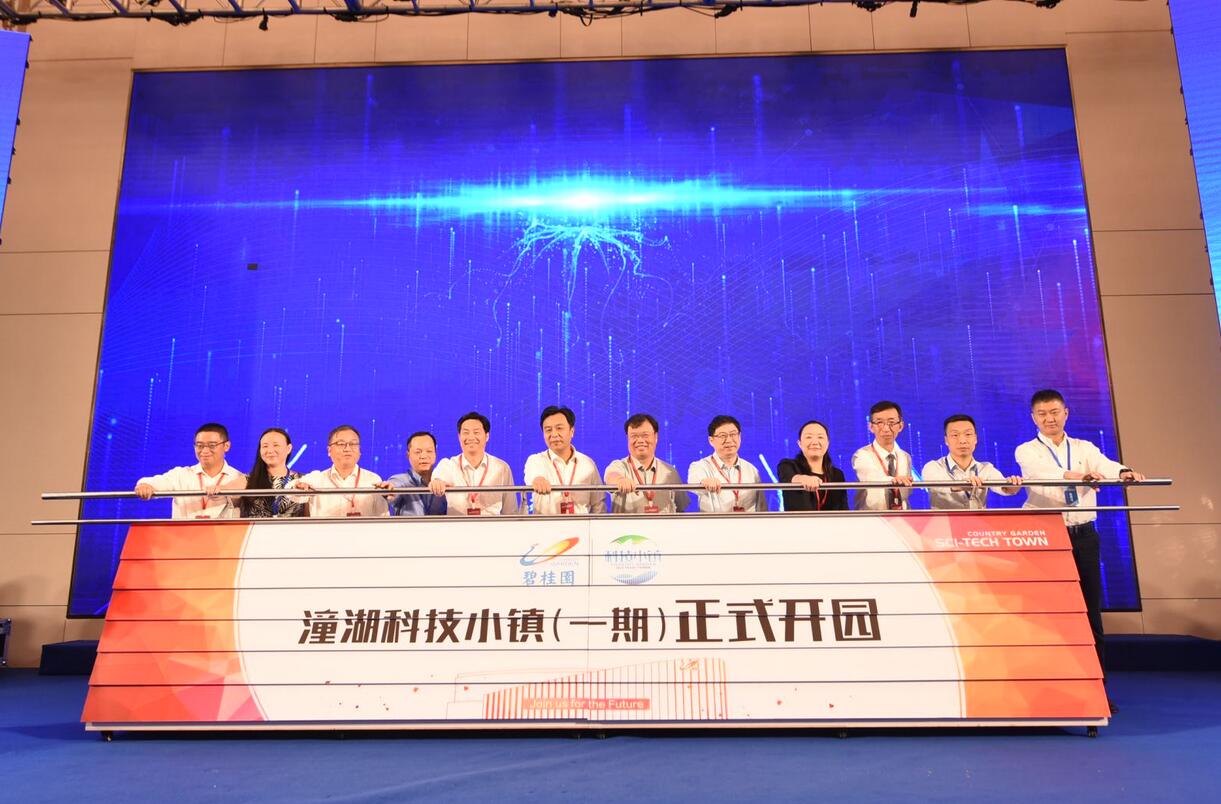 活动现场,惠州市市委常委、常务副市长胡建斌,广东省经信委党组成员、副主任杨鹏飞,广东省科技厅副厅长杨军,惠州市仲恺高新区委副书记、区管委会主任张莉兰,惠州市潼湖生态智慧区党工委副书记、管委会主任陈德华,碧桂园集团党委书记、集团总裁莫斌,深圳市英唐智能控股股份有限公司董事长钟勇斌等嘉宾代表共同推动启动杆,宣布潼湖科技小镇正式开园。
