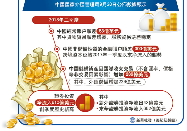 外匯局新聞發言人表示,2018年二季度,中國經常賬戶和非儲備性質的金融賬戶呈現「雙順差」,儲備資產增加,國際收支保持基本平衡。