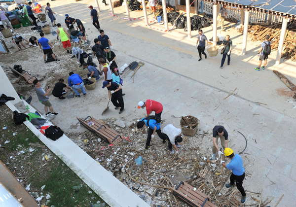 從下午15時抵達海灘開始,大家便全力投入清理工作,齊心協力,鐵鏟、釘耙、掃把等多種工具各顯神通,工具使用不便之處,就用手刨,耐心細緻地將海灘堆積的大量垃圾雜物進行分類清理。分揀出的石塊及細沙回填海灘,樹枝樹葉集中堆放,待乾燥後另行處理,還清理垃圾80余袋。從烈日當空到夕陽西沉,所有參加清理工作的員工顧不上休息與飲水,經過近三個半小時的連續奮戰,初步恢復了海灘走廊過道的原有面貌,路過的市民紛紛稱讚。