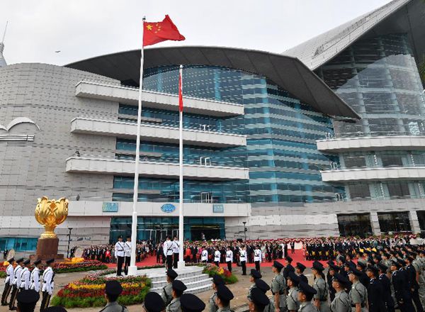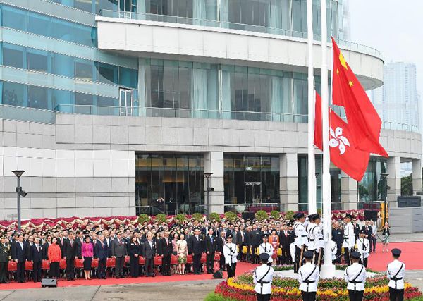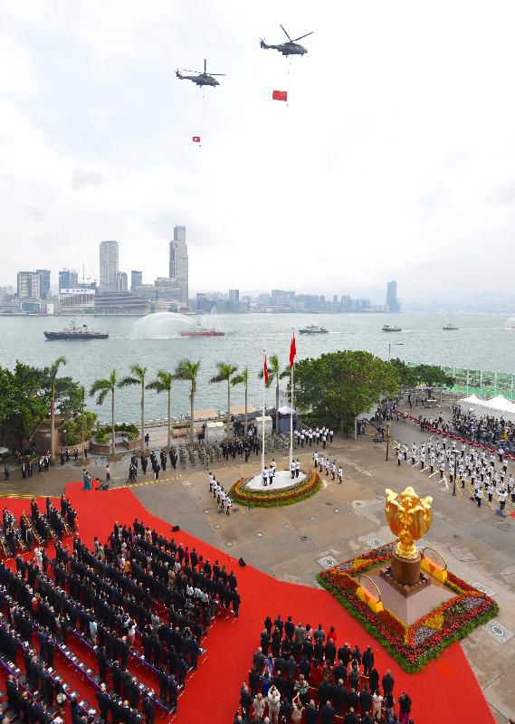 在升旗禮上,隨著國歌響起,警察儀仗隊升起國旗及區旗,各紀律部隊成員在場敬禮,政府飛行服務隊直升機在維港上空飛過,展示國旗及區旗,消防船在維港海面射水敬禮。