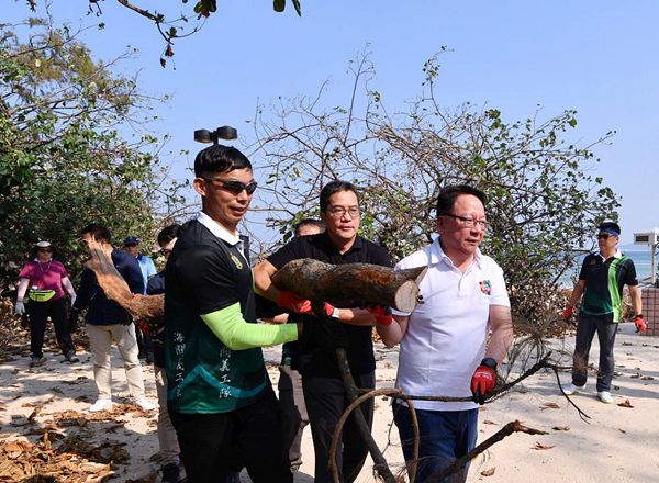 黃偉綸(中)連同特首辦主任陳國基(右),與由六支紀律部隊人員組成的義工隊,一起到石澳泳灘清理塌樹、收拾垃圾。 黃偉綸網誌圖片