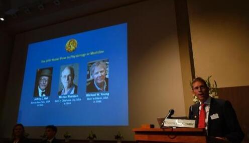 资料图:当地时间2017年10月2日中午,2017年诺贝尔生理学或医学奖揭晓,杰弗瑞·霍尔(Jeffrey C. Hall)、迈克尔·罗斯巴什(Michael Rosbash)和迈克尔·杨(Michael W. Young)凭借“发现控制生理节律的分子机制”荣获该奖项。