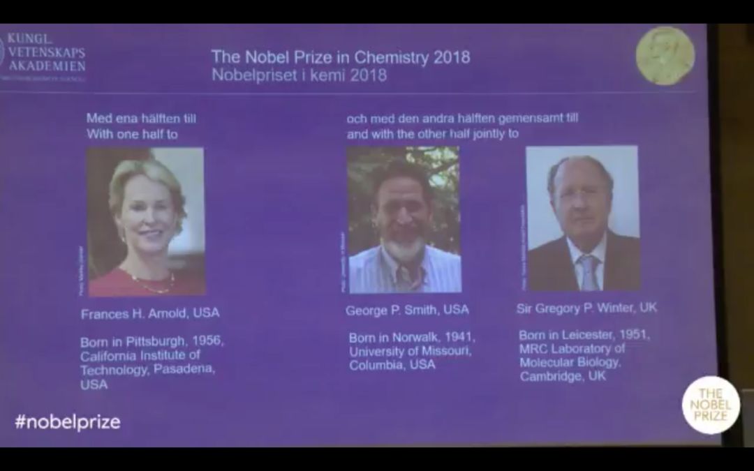 10月3日,2018年諾貝爾化學獎揭曉,加州理工學院科學家弗朗西斯·阿諾德、密蘇裏大學科學家喬治·史密斯及劍橋大學MRC分子生物實驗室格雷格·保羅·溫特獲得2018諾貝爾化學獎,以表彰他們 “肽類和抗體的噬菌體展示技術”的貢獻。