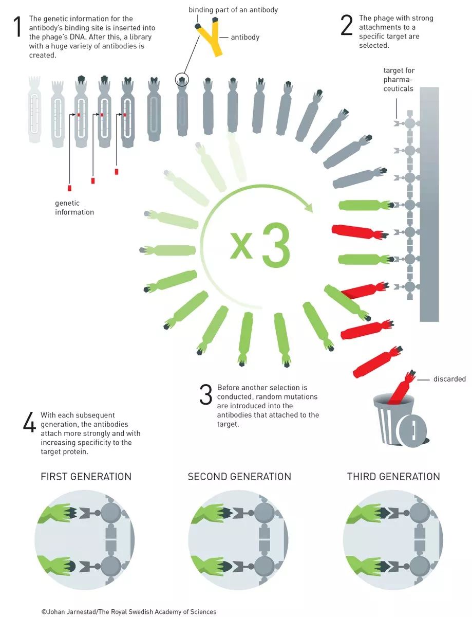 2018年諾貝爾化學獎獲得者“控制”了進化,並利用這一手段為人類帶來巨大的福祉。由人為定向進化產生的酶,已經被用於制造包括生物燃料到藥物的各種物質。而通過一種名叫“噬菌體展示”(phage display)的方法產生的抗體,可以用於對抗人類的自身免疫疾病,並且在一些情況下治愈轉移性癌症。