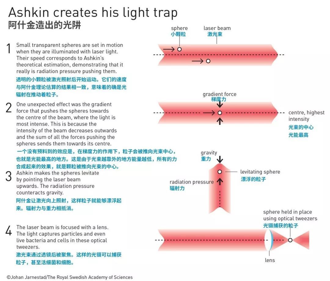 阿瑟·阿什金(Arthur Ashkin)發明了光學鑷子,能用激光束夾起粒子、原子、分子。它還能夾起病毒、細菌及其他活細胞,並能讓它們在檢查和處理時不被損壞。阿什金的光學鑷子為觀察和控制生命的機器創造了全新的機會。