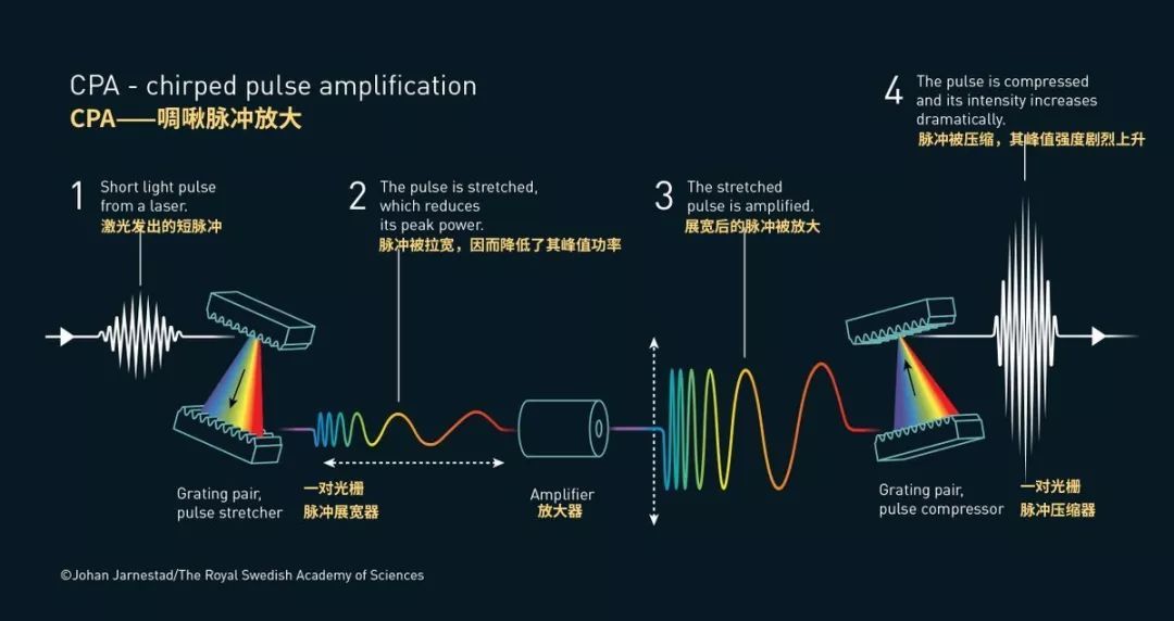 穆魯和斯特裏克蘭發明了一種叫作“啁啾脈沖放大”的技術,簡單解釋就是,將短激光脈沖適時拉伸以減少峰值功率,然後放大它,並最終把它徹底壓縮,這能讓更多的光被壓縮在一個極小空間內,從而大幅提高脈沖的強度。