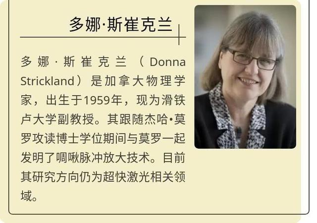 斯特裏克蘭,長期從事強激光與物質非線性相互作用、非線性光學以及超短超強激光系統的研究,她在美國羅徹斯特大學獲得博士學位。她是諾獎曆史上第3位女性物理學獎獲得者,也是時隔半世紀後女性再度獲得物理學諾獎。前兩位是1903年獲獎的居裏夫人,和1963年獲獎的瑪麗亞·格佩特-梅耶。