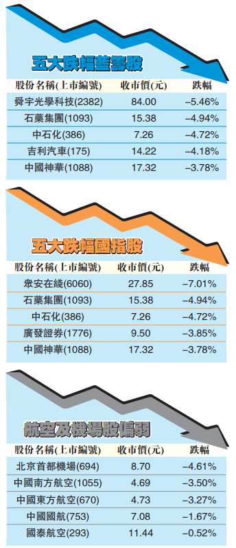 航空及機場股亦偏弱,當中北京首都機場(694)收市報8.7元,下跌4.61%;中國南航(1055)及東航(670)分別跌3.5%和3.27%。國指收報10547點,跌238點或2.2%。內地股市仍然為國慶假期休市,下周一(8日)才復市。