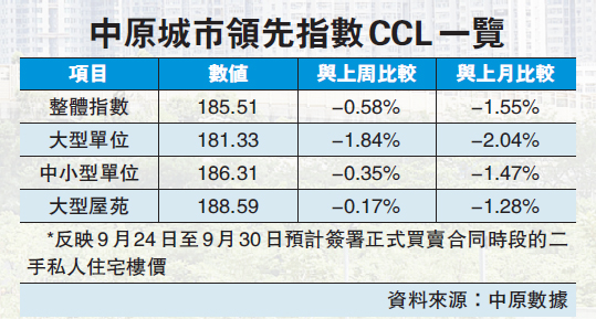 【香港商報网訊】記者馮金鋒報道:中美貿易戰陰雲未散,加上銀行12年來首次加息,樓市氣氛持續淡靜,反映二手樓價的中原城市領先指數CCL進一步下跌,最新報185.51點,按周跌0.58%。這已是該指數連續5周未錄得升幅,是2015年以來最長調整期。中原地產研究部高級聯席董事黃良昇稱,踏入第四季,整體樓價將出現較全面的調整信號,並將會在10月下旬公布的CCL開始反映。美聯物業首席分析師劉嘉輝預期,第四季樓價回落幅度不大,估計約2%至3%。