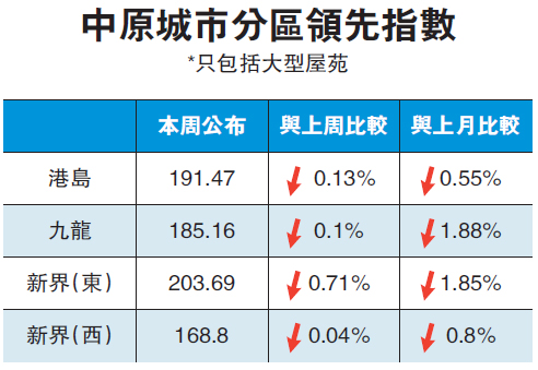 黃良昇指出,近4周計,4大整體指數齊跌的情況出現3次。4區樓價方面,本周一升三跌。新界西CCL Mass報168.80點,按周升0.04%,結束8周連跌。新界東CCL Mass報203.69點,按周跌0.71%,連跌5周共2.46%。港島CCL Mass報191.47點,按周跌0.13%。九龍CCL Mass報185.16點,按周跌0.10%。