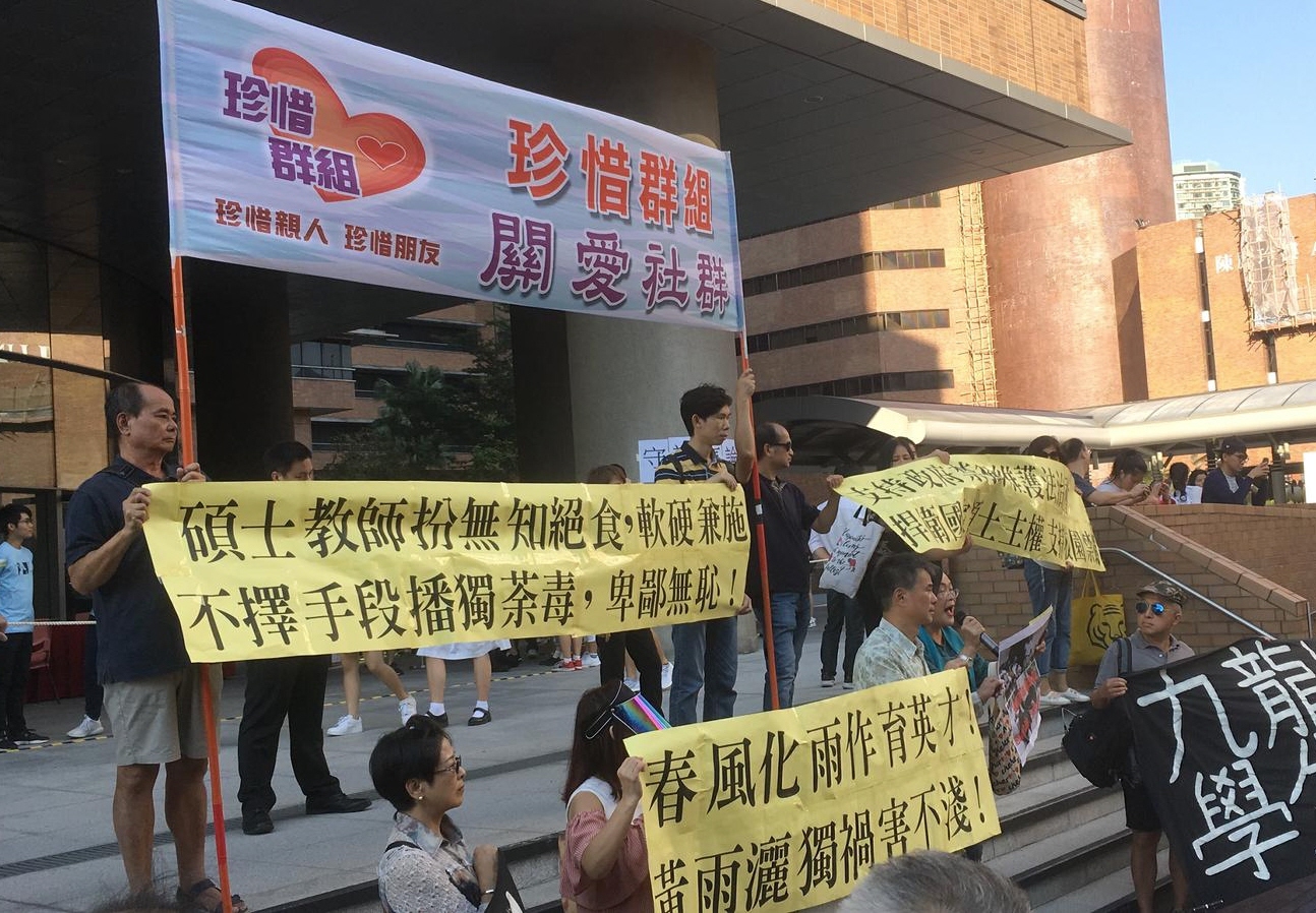 另外,反對團體「珍惜群組」昨日下午到理大示威,拉起橫額及高叫口號,指學生為求目的不擇手段,以絕食的方式煽動他人,支持校方收回民主牆管治權。