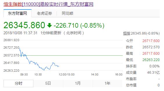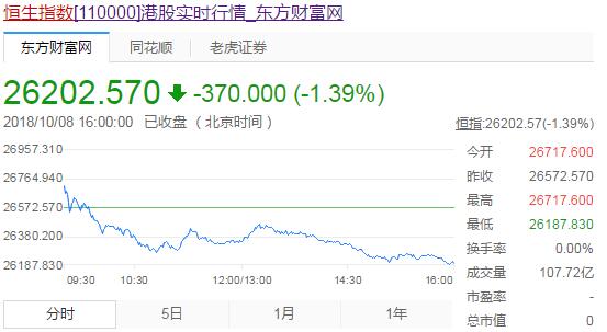 截至收盘,恒指跌1.39%,报26202点,创逾1年新低;国企指数跌1.3%,报10393点;红筹指数跌2.06%,报4197点;大市成交965.9亿港元。恒指今早低开逾140点,大市开盘后即反身下跌,市场尽显弱市,指数跌幅持续扩大,恒指退守26000点关口;全天盘中最低见26187点,创15个月新低,最高报26717点。