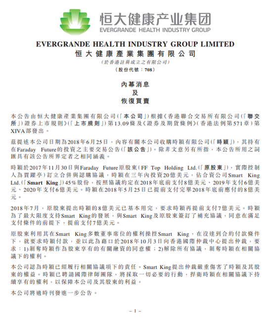 两日过后,原因揭晓,事涉贾跃亭及FF(法拉第未来)。FF股东Smart King向香港国际仲裁中心提出仲裁,要求剥夺时颖公司(恒大健康投资主体)在相关协议下的权利。