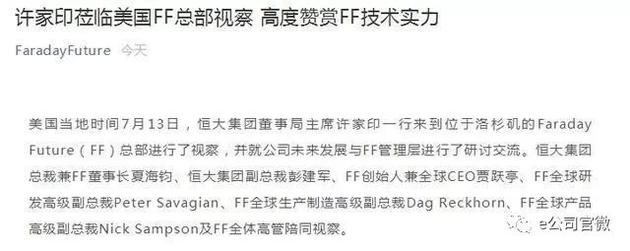 而在美国当地时间7月13日,恒大集团董事局主席许家印一行来到位于洛杉矶的Faraday Future总部进行了视察,并就公司未来发展与FF管理层进行了研讨交流。恒大集团总裁兼FF董事长夏海钧、恒大集团副总裁彭建军、FF全球CEO贾跃亭及FF全体高管陪同视察。许家印一行体验了FF首款高端车型FF91。许家印对于FF全球领先的产品和技术给予了肯定,对于FF91的内外饰设计和产品性能给予了赞赏。
