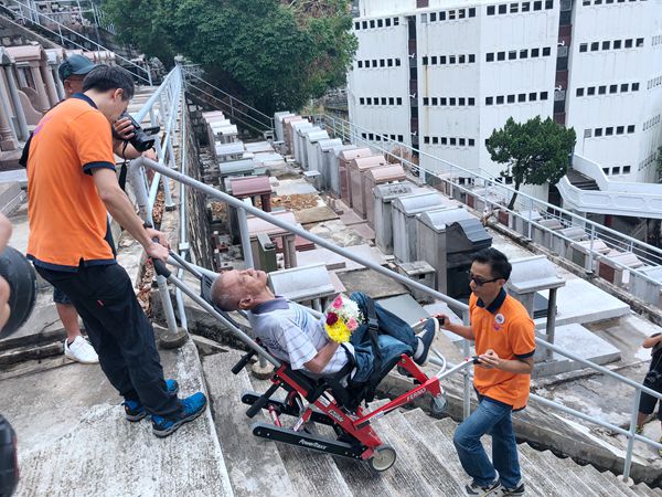 聖雅各福群會推樓梯機,幫助70歲斷肢的李伯伯上山掃墓,拜祭亡兄。記者 馮煒強攝