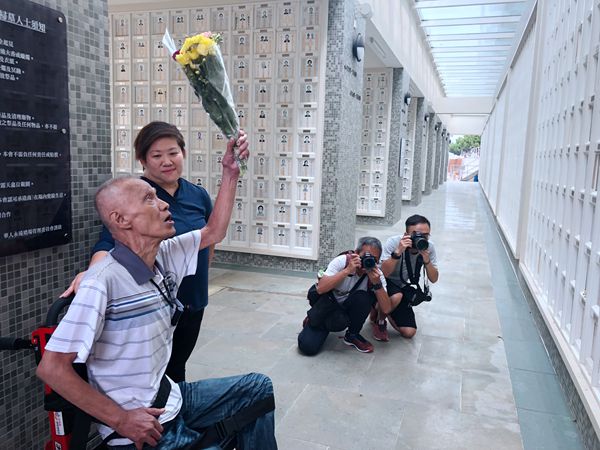 在「落得樓」服務協助下,首次來到胞兄墓碑前的李伯伯手執鮮花拜祭時激動地表示:「哥,我終於來了,我來了,我仍活着你不用擔心。」