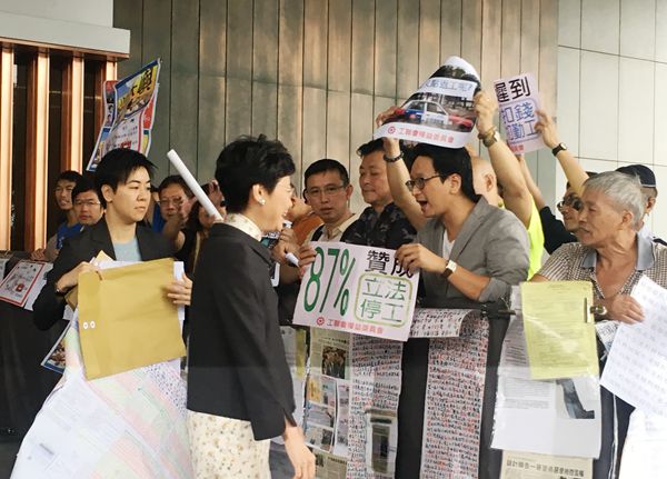 工聯會請願促立法制訂惡劣天氣停工安排,行政長官林鄭月娥(左)親自接信。