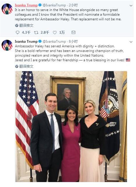在特朗普发表上述声明后不久,伊万卡在推特中排除了自己会成为新联合国大使的可能。“在白宫同如此多的优秀的同事们工作是一份荣耀,我知道总统会提名一位合适的人选接任黑利大使,但那个人不会是我。”伊万卡表示。