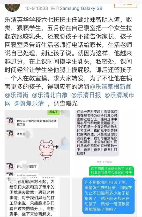 当天下午1点33分,有网友在微博发文称,乐清英华学校小学老师郑智明多次猥亵女学生,并且威胁孩子不许告知家长,而学生向生活老师哭诉并希望通过其打电话通知家长时,却被生活老师制止。此后,郑智明猥亵女学生的行为更变本加厉:“乐清英华学校六七班班主任湖北郑智明人渣,败类,猥亵学生,五月份在自己寝室把一个女生拉起衣服咬乳头,还威胁孩子不能告诉家长,孩子回寝室哭,告诉生活老师打电话给家长,生活老师说自己处理,别让孩子说。就因为这样,他越来越过分,在上课时间摸学生乳头,私密处,课间时间经常让学生坐他腿上摸屁股,课后还留孩子一个人在教室摸。”