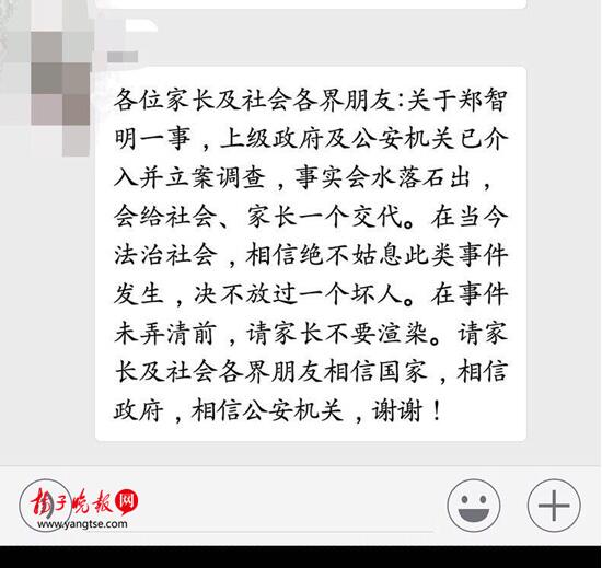 最先曝光这件事的网友对记者说,自己的孩子也就读于乐清英华学校,微博上贴出的短信截图中显示的电话是郑智明的妻子而非本人,学校的老师告知各班级家长,关于郑智明一事,上级政府及公安机关已经介入并立案调查,等事实水落石出后会给社会和家长一个交代,绝不姑息此类事件发生。家长希望涉事老师能得到法律的审判,也希望学校能够道歉。