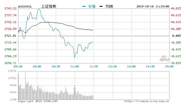10月10日,沪深两市小幅高开。油气股盘初继续活跃,煤炭、基建等板块均有拉升,一度带动沪指涨逾0.8%。不过,多个板块随后回落,股指集体跳水翻绿,沪指盘中逼近2700点,深成指最低触及7952.13点,创4年新低。午市休盘前,大盘跌幅略有收窄,创业板指翻红。盘面上,多数板块飘绿,建筑装饰走强,黄金板块继续活跃,食品饮料、医药生物领跌。题材概念方面,钛白粉指数领涨,次新股、集成电路等概念涨幅居前,高送转指数领跌。两市成交量较上一交易日略有放量。