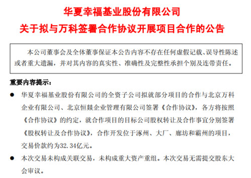 10月9日,华夏幸福宣布,与北京万科及北京恒燚企业管理有限公司签订合作协议及股权转让协议,北京恒燚(由北京万科全资持有)将收购旗下涿州公司80%股权、裕景公司80%股权、裕达公司80%股权、廊坊公司80%股权及霸州公司65%股权,交易价款约为32.34亿元。